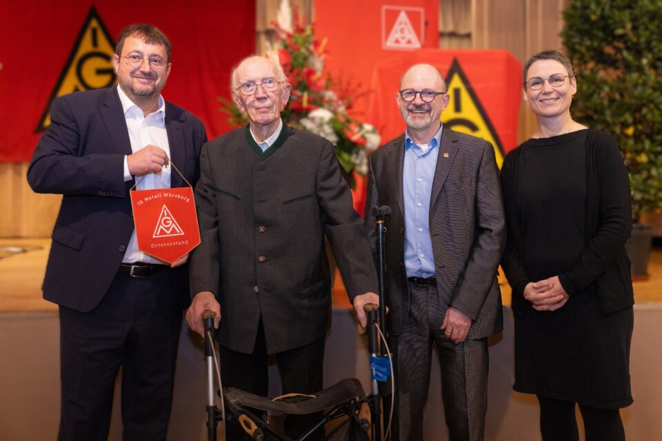 Im Bild oben von links: Norbert Zirnsak, Jubilar Robert Zirkelbach, Frank Firsching und Ulrike Eifler bei der feierlichen Übergabe des Ehrenwimpels des Ortsvorstandes der IG Metall Würzburg für 80 Jahre Mitgliedschaft in der Gewerkschaft.