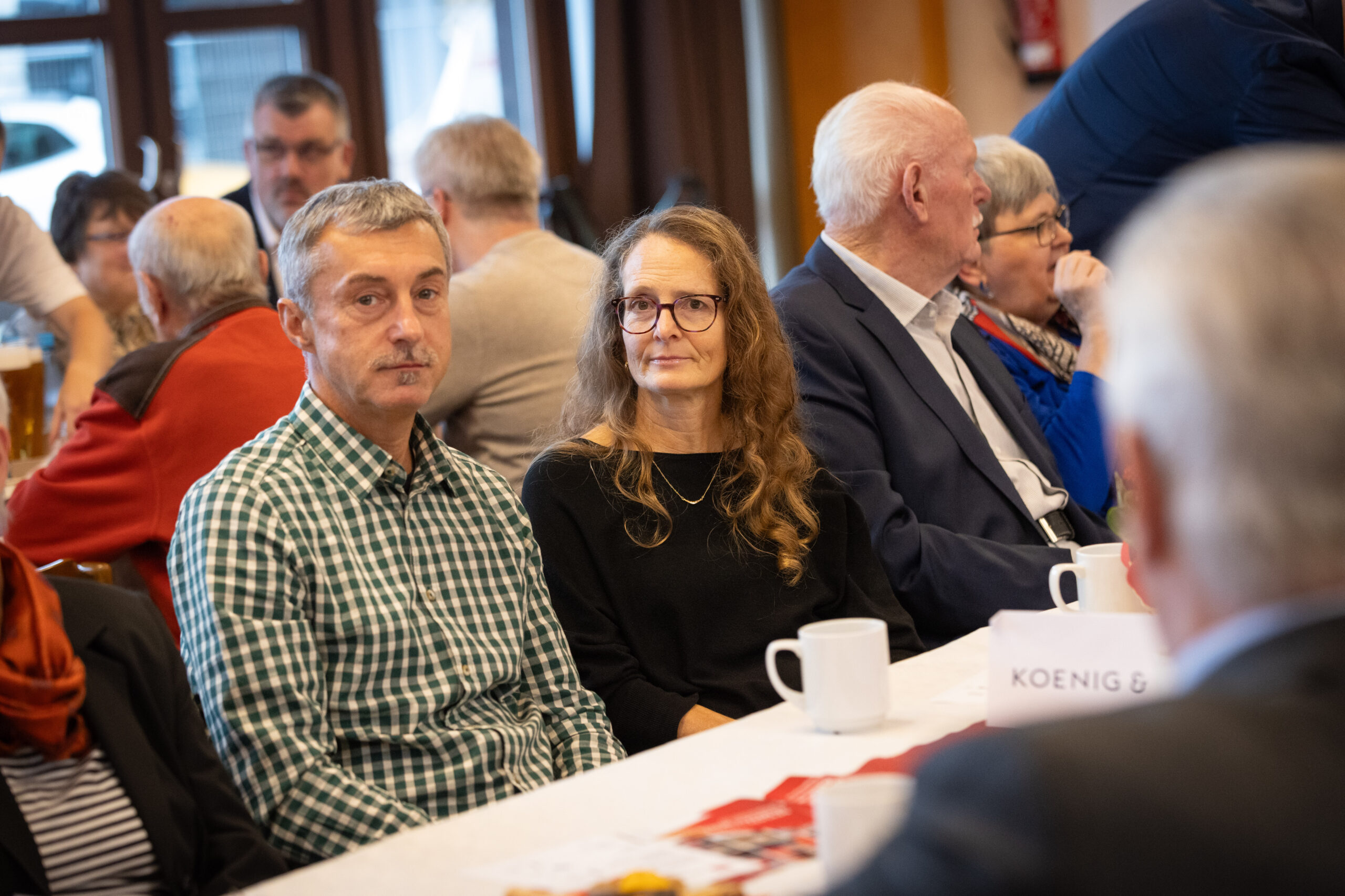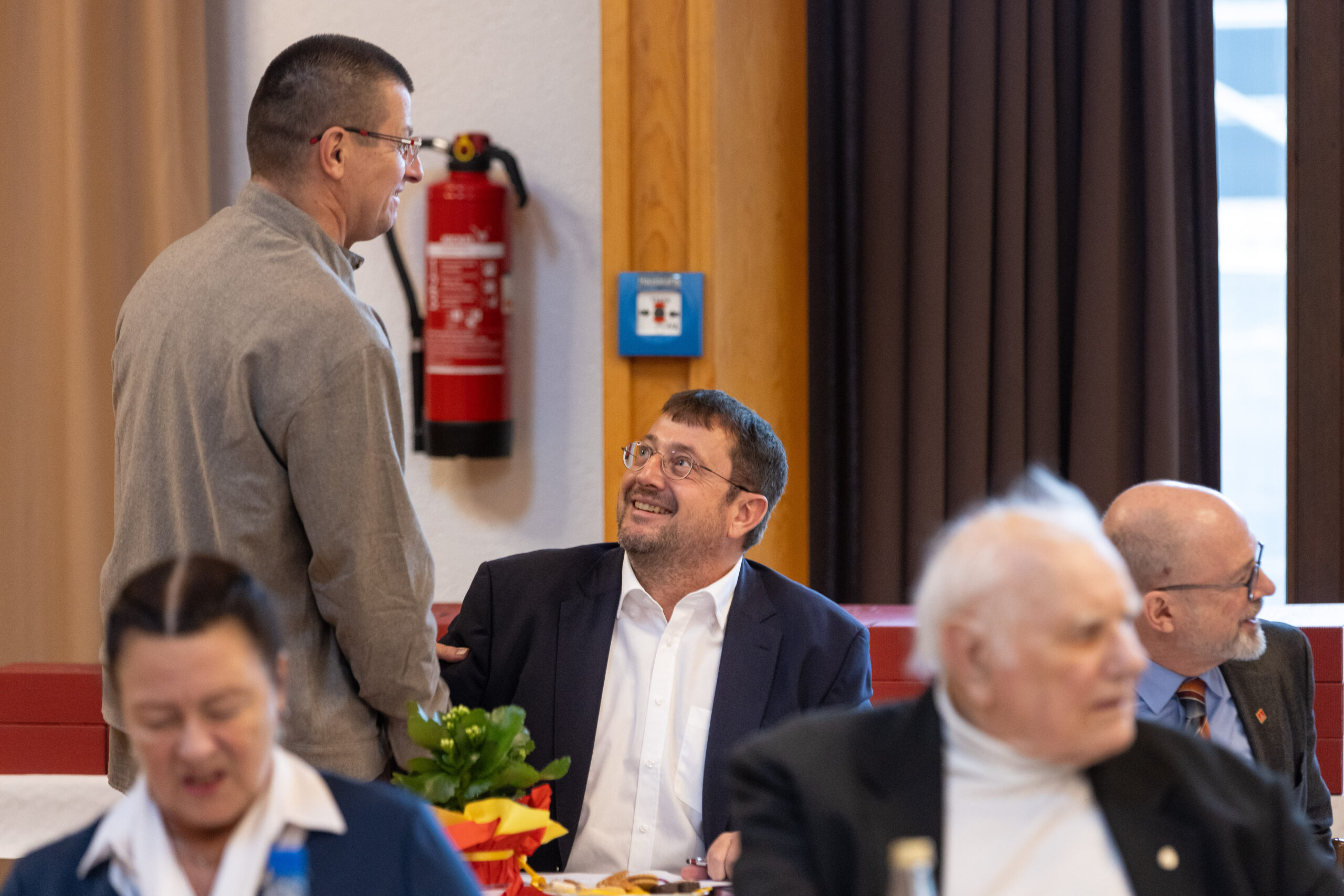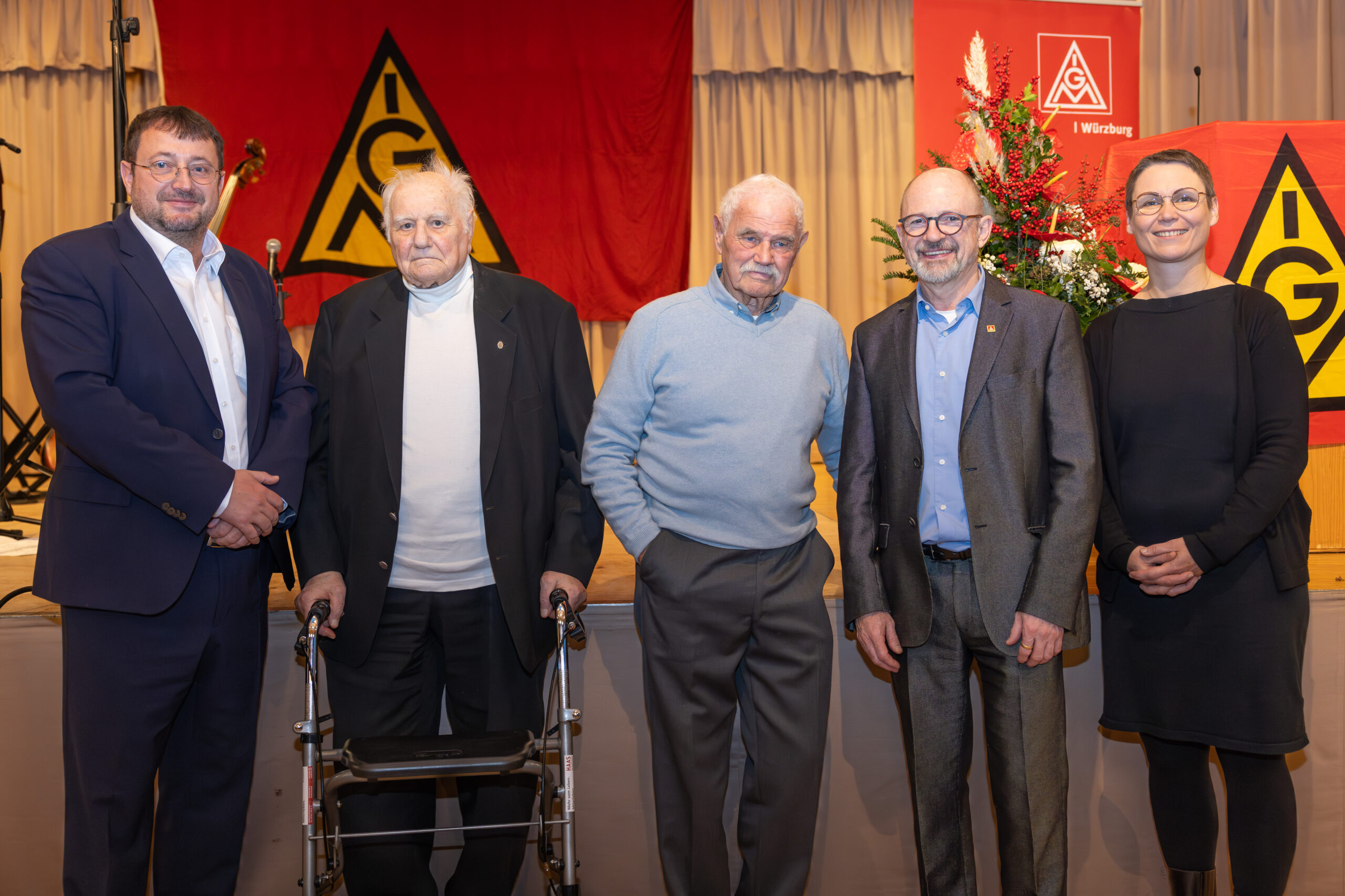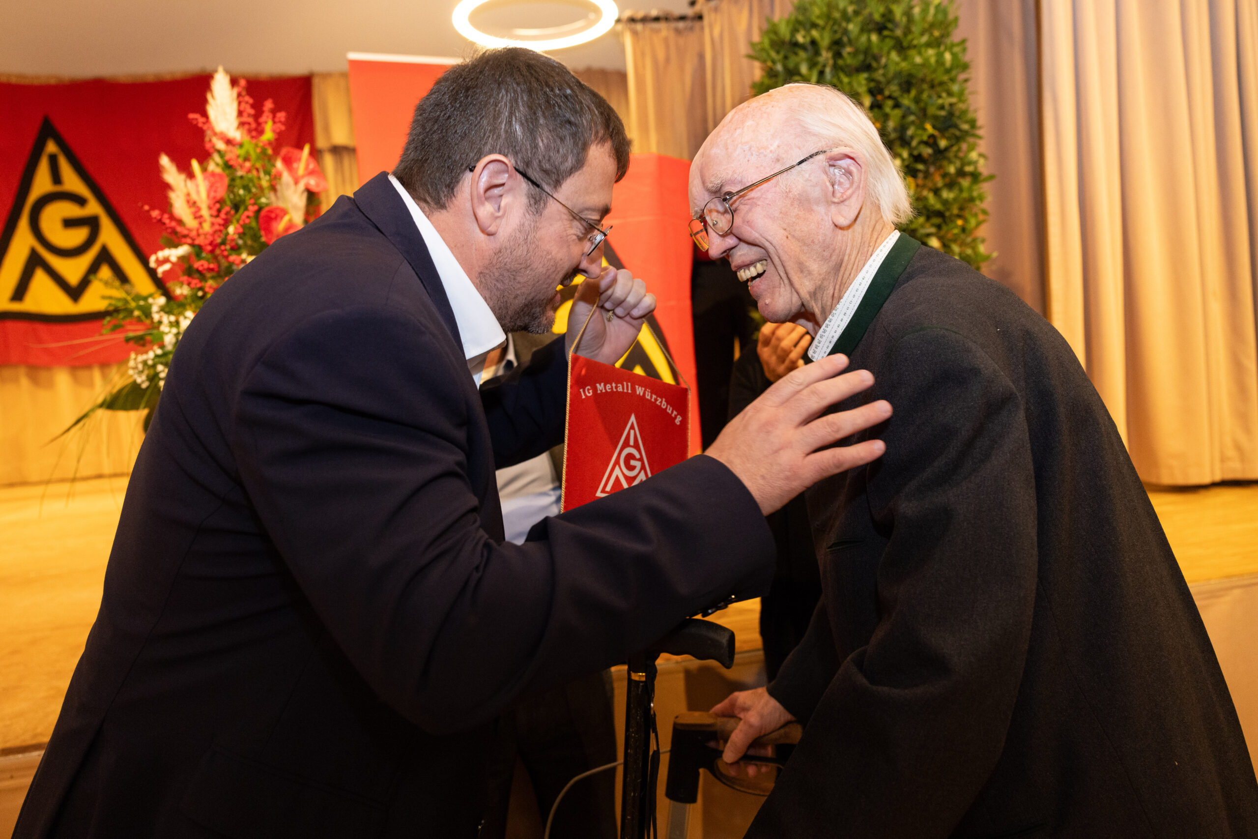 Ein besonders bewegender Moment war die Ehrung von Robert Zirkelbach, der 1945 als junger Mann beim Würzburger Druckmaschinenbauer Koenig & Bauer der IG Metall beitrat. Für seine 80-jährige Mitgliedschaft wurde er als erster Jubilar in der Geschichte der IG Metall Würzburg mit dem Ehrenwimpel des Ortsvorstands ausgezeichnet. Als Norbert Zirnsak, Erster Bevollmächtigter der IG Metall Würzburg, die Auszeichnung überreichte, erhoben sich alle Gäste zu stehendem Beifall.