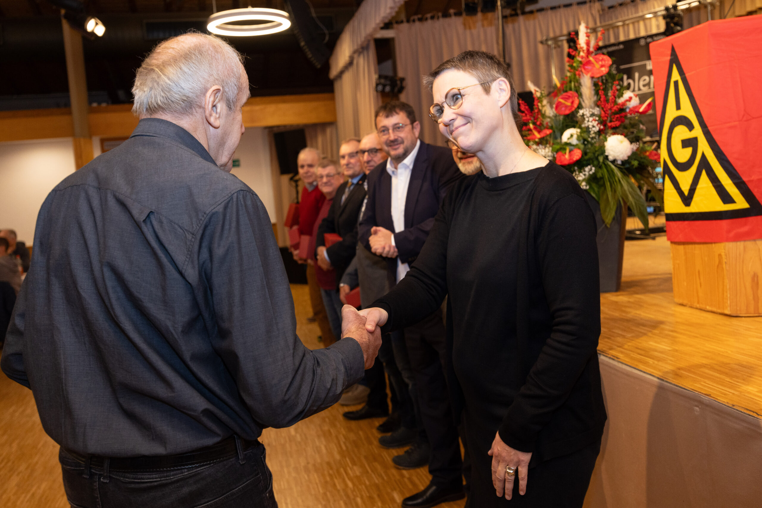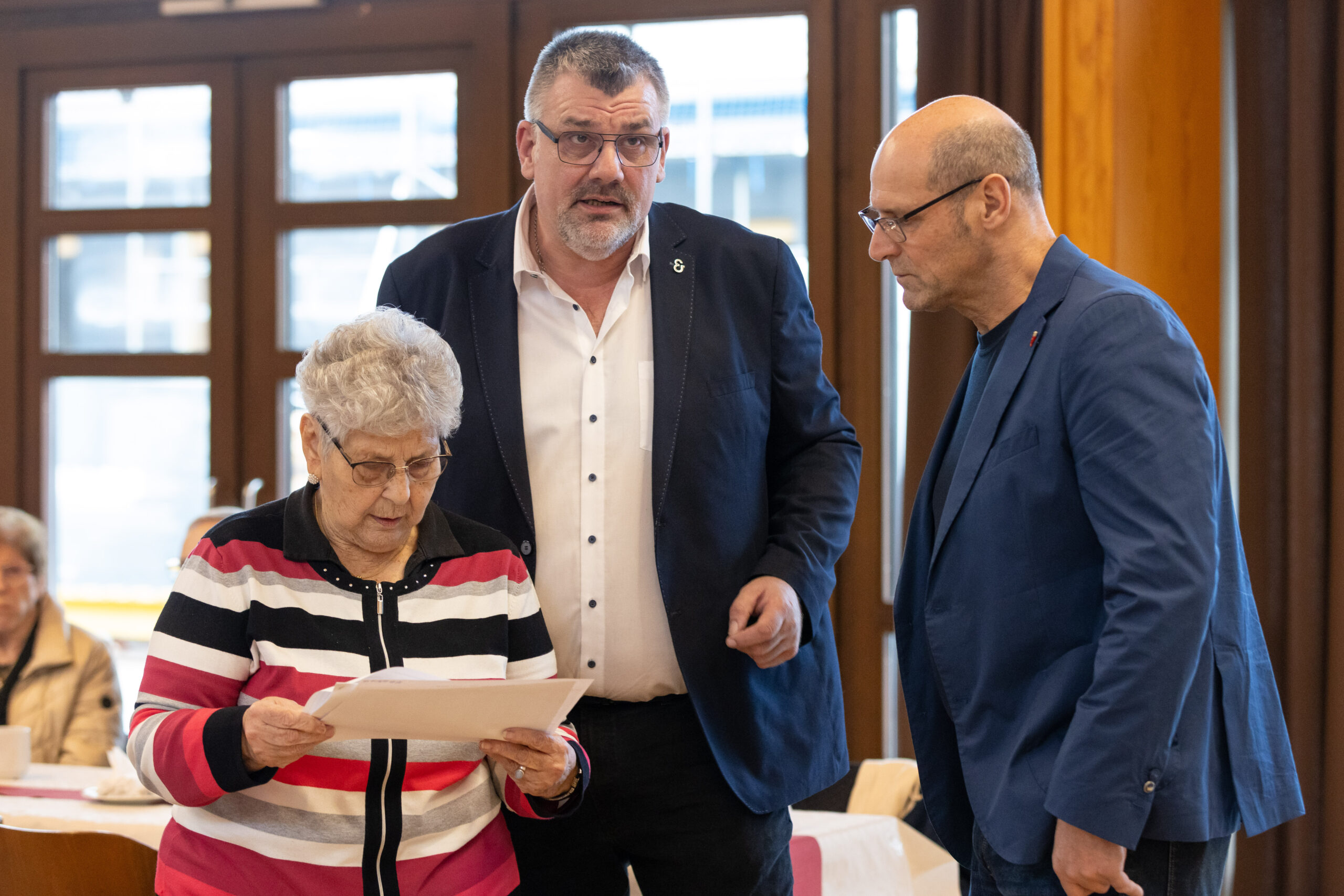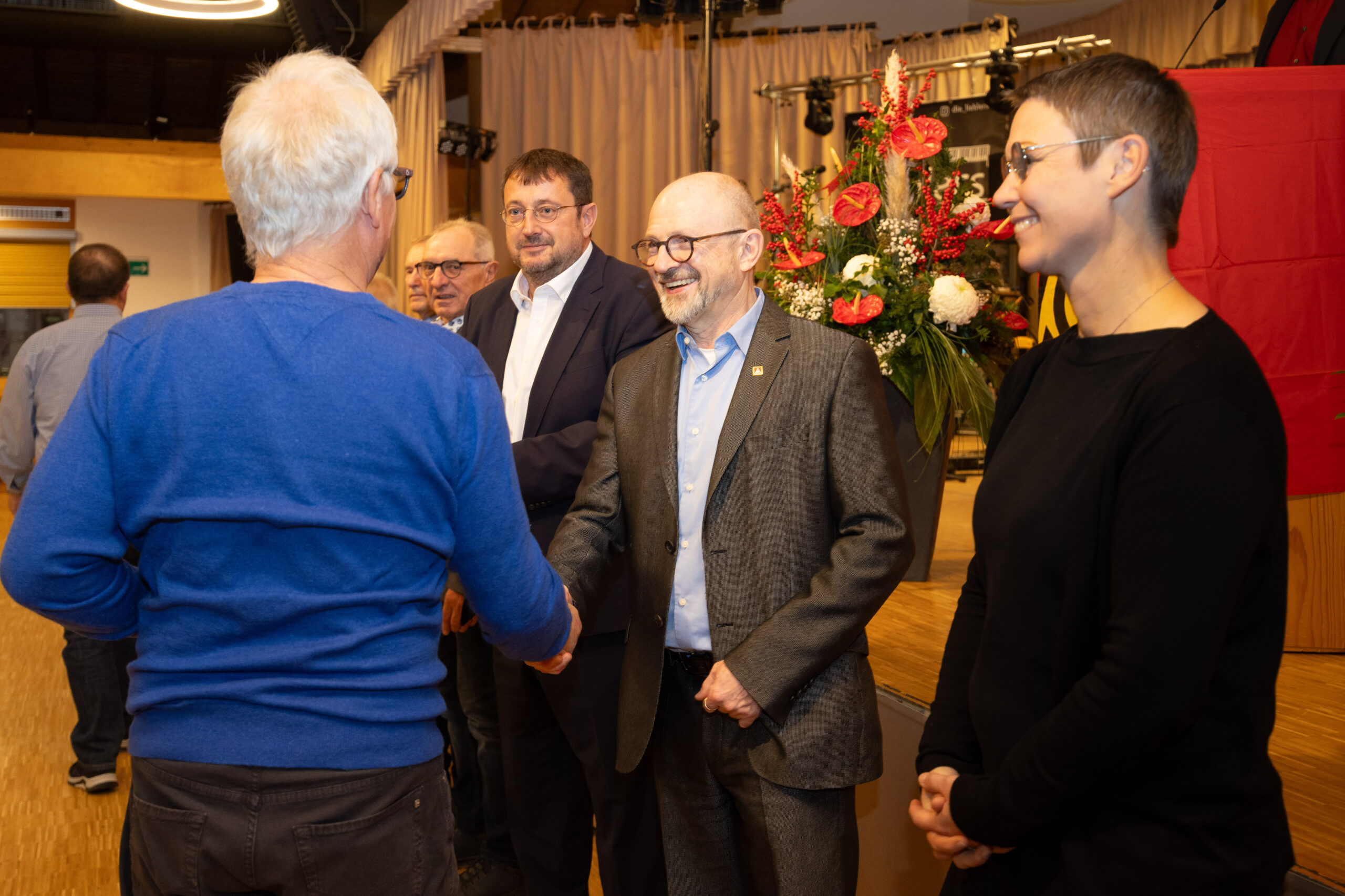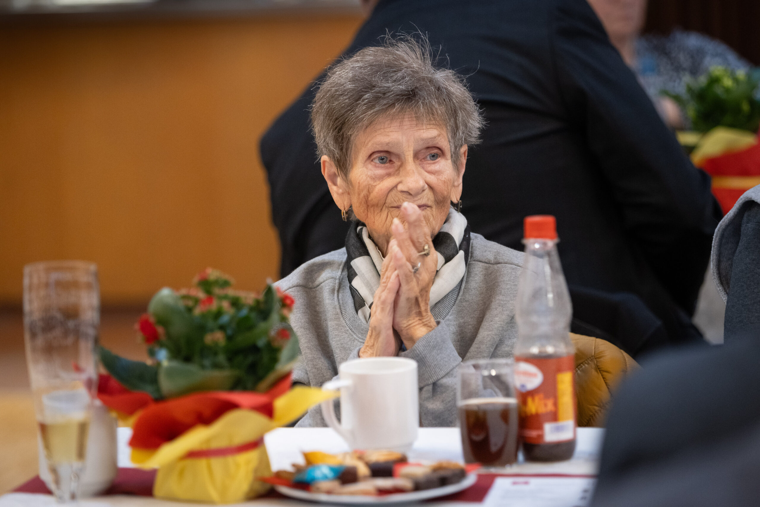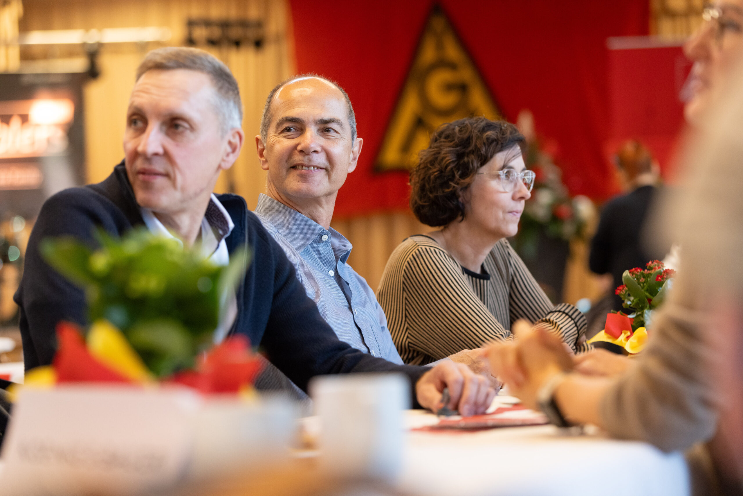 Ein besonders bewegender Moment war die Ehrung von Robert Zirkelbach, der 1945 als junger Mann beim Würzburger Druckmaschinenbauer Koenig & Bauer der IG Metall beitrat. Für seine 80-jährige Mitgliedschaft wurde er als erster Jubilar in der Geschichte der IG Metall Würzburg mit dem Ehrenwimpel des Ortsvorstands ausgezeichnet. Als Norbert Zirnsak, Erster Bevollmächtigter der IG Metall Würzburg, die Auszeichnung überreichte, erhoben sich alle Gäste zu stehendem Beifall.