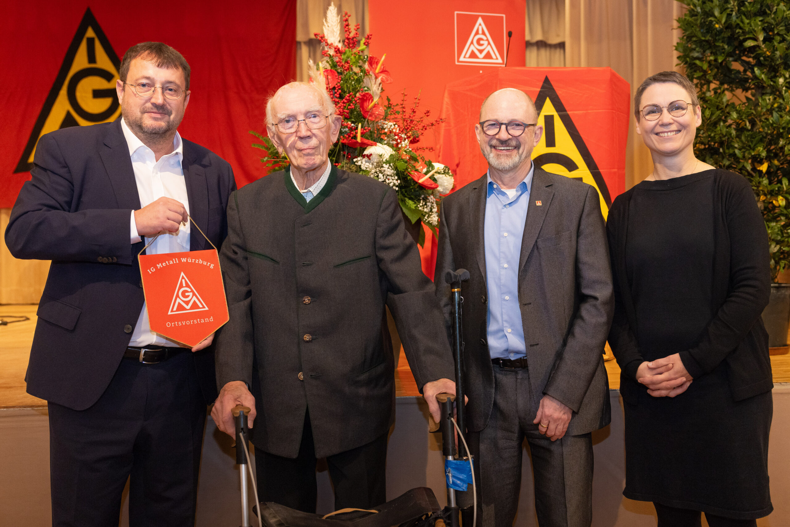 Im Bild oben von links: Norbert Zirnsak, Jubilar Robert Zirkelbach, Frank Firsching und Ulrike Eifler bei der feierlichen Übergabe des Ehrenwimpels des Ortsvorstandes der IG Metall Würzburg für 80 Jahre Mitgliedschaft in der Gewerkschaft.