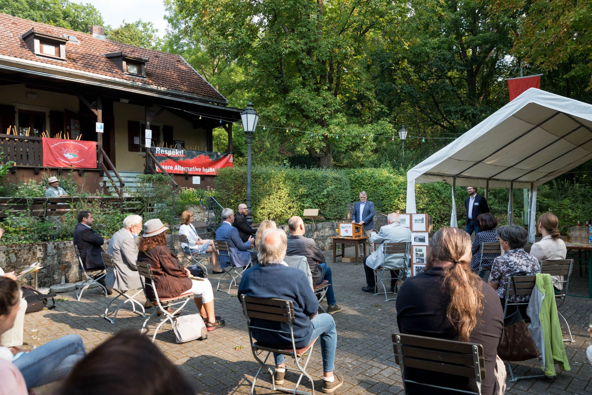 Naturfreunde und IG Metall Würzburg haben am 12. September 2020, genau hundert Jahre nach der Grundsteinlegung, ein gusseisernes Respekt-Schild am altehrwürdigen Veitshöchheimer Naturfreundehaus angebracht. Unter Beisein der stellvertretenden Landrätin des Landkreises Würzburg, Karen Heußner und dem stellvertretenden Bürgermeister der Gemeinde Veitshöchheim, Elmar Knorz, wurde das Schild unter Corona Bedingungen im kleinen Rahmen von Gunnar Haeuschkel (Naturfreunde Würzburg) und Norbert Zirnsak (2. Bevollmächtigter der IG Metall Würzburg) enthüllt.