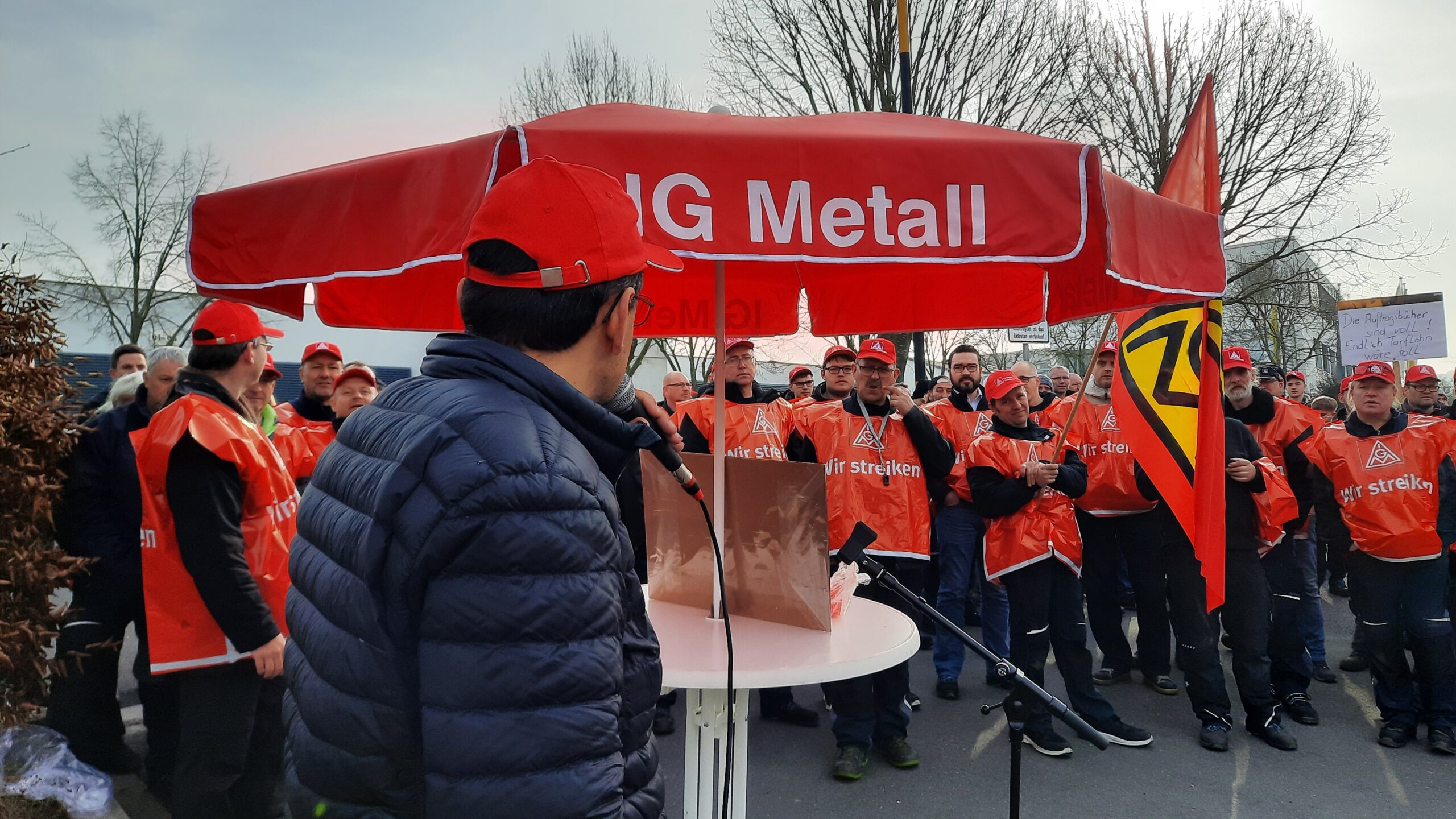 Am Donnerstag (14.03.2024) stand die Produktion beim Backautomatenbauer Miwe im unterfränkischen Arnstein 90 Minuten lang still. 100 Kolleginnen und Kollegen der Frühschicht folgten einem Aufruf der IG Metall zum Warnstreik. Die Tarifverhandlungen, die seit August des letzten Jahres bei Miwe stattfinden, blieben bisher ergebnislos. Die Belegschaft ist sauer.